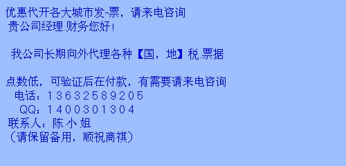 [ ^_^]您好:我司长期向外【代 理】全国各种 【国 地】税【�】票税率低,均可验证后在付款。 电话:1 3 5 3 0 2 8 4 2 3 3 林小姐 Q Q: 5 6 9 0 3 2 2 3 4 @tom.com为明天做准备的最好方法就是集中你所有智慧,所有的热忱,把今天的工作做得尽善尽美,这就是你能应付未来的唯一方法。 |